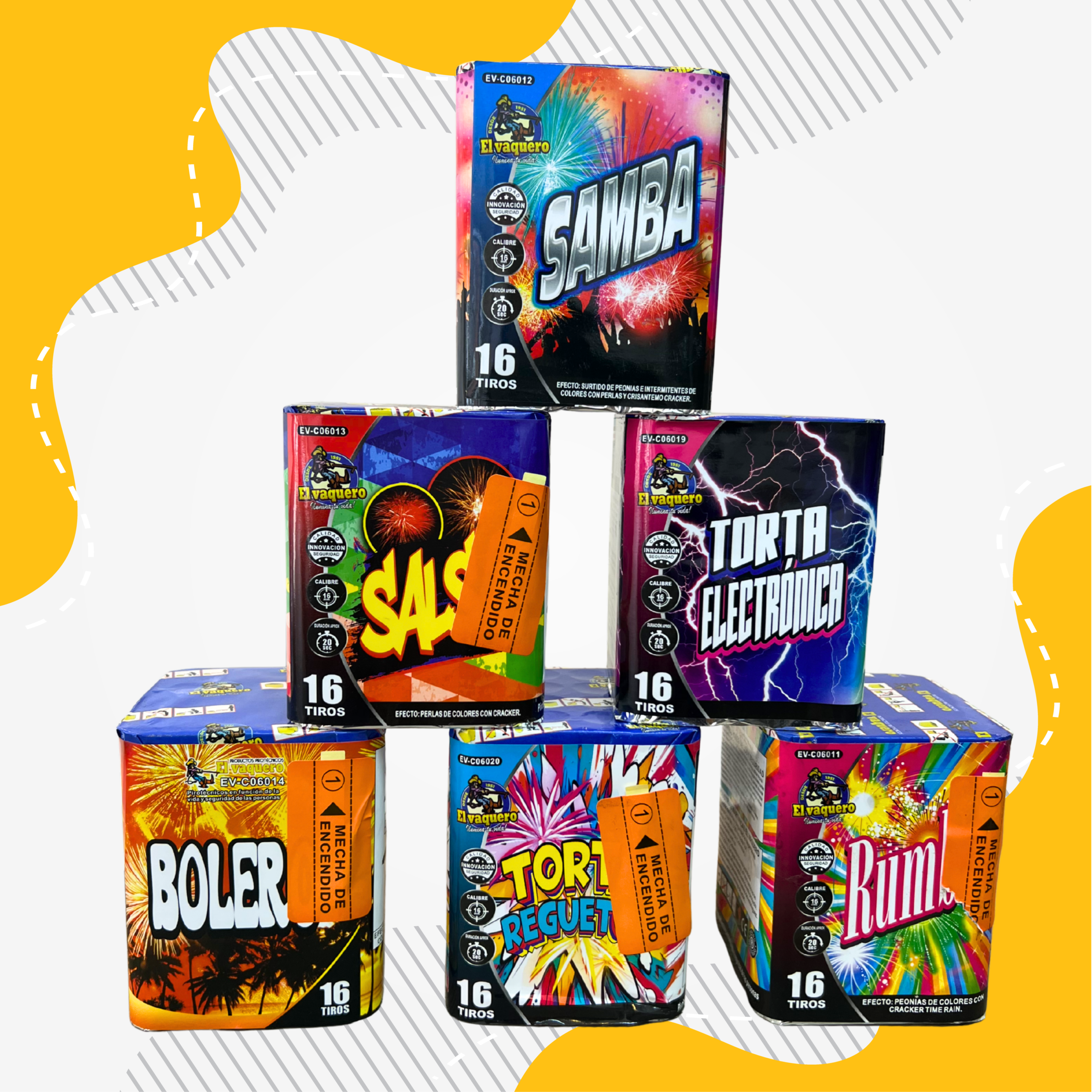Este surtido contiene 6 tortas de 16 tiros cada una: 1 torta Samba 1 Torta Salsa 1 Torta Electronica 1 Torta Bolero 1 Torta Regueton 1 Torta Rumba