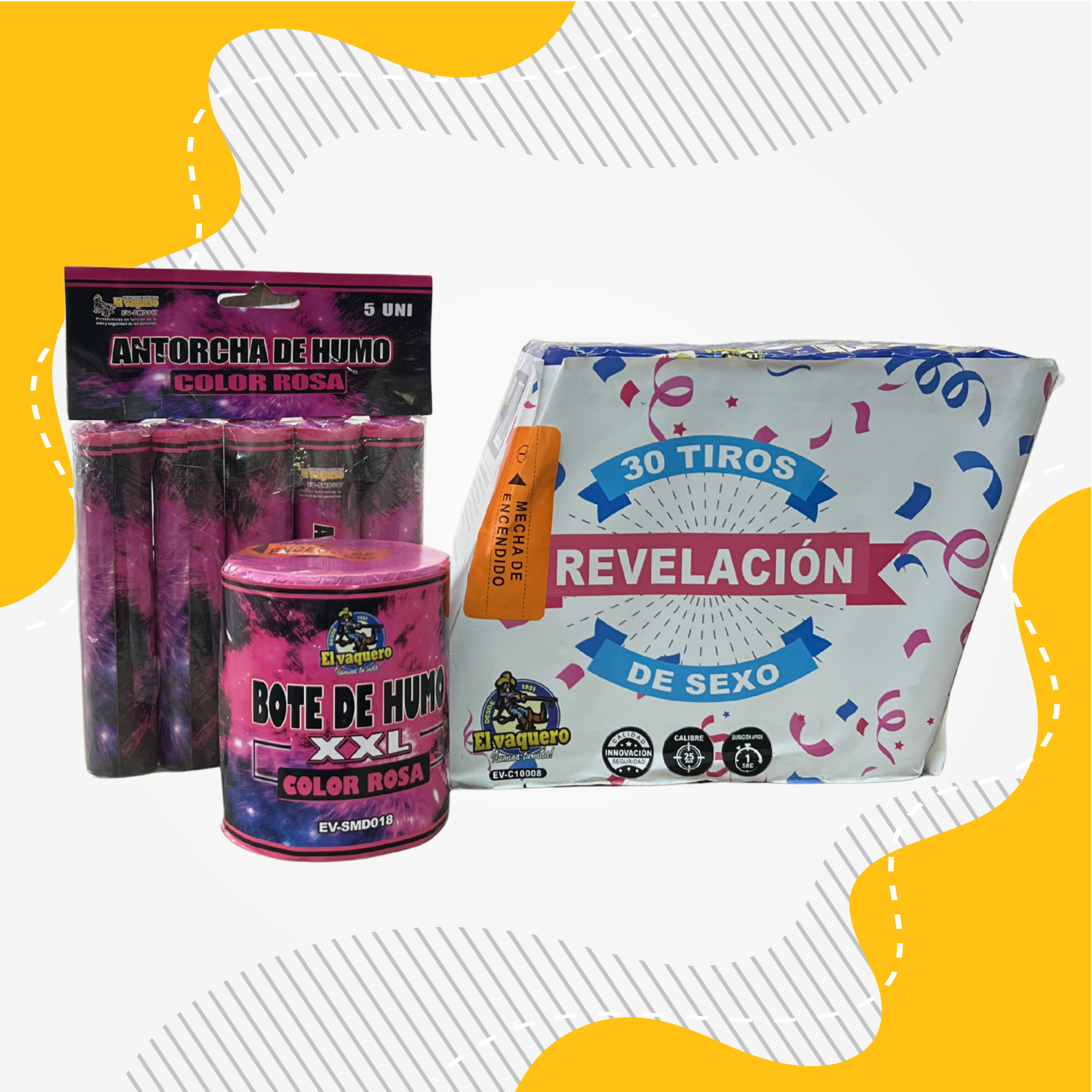 1 TORTA DE REVELACIÓN STREAMER DE 30 TIROS 1 BOTE DE HUMO XXL 1 PAQUETE DE 5 UNIDADES DE ANTORCHAS DE HUMO